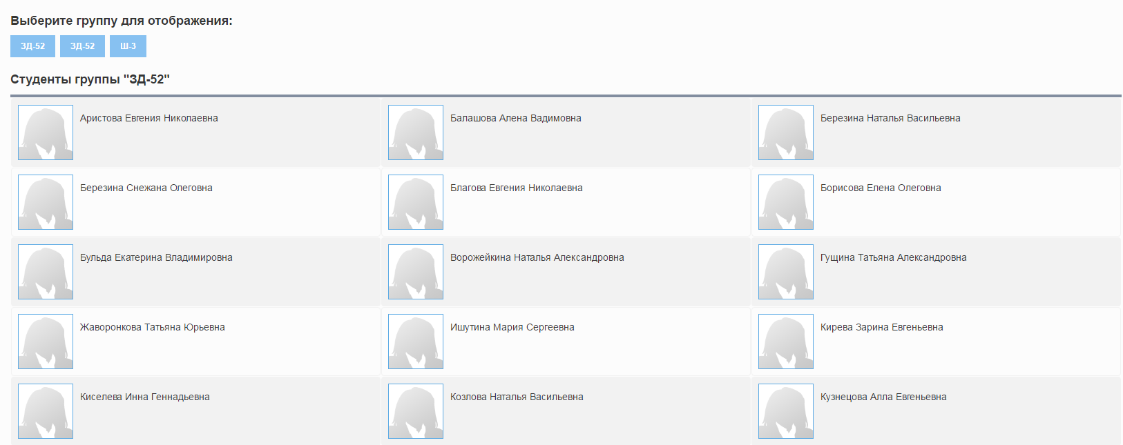 На вкладке «Моя группа» отображается список студентов группы (Рисунок 24). Если студент обучается в нескольких группах, в графе «Выберите группу для отображения» нажмите на группу, по которой необходимо просмотреть информацию.