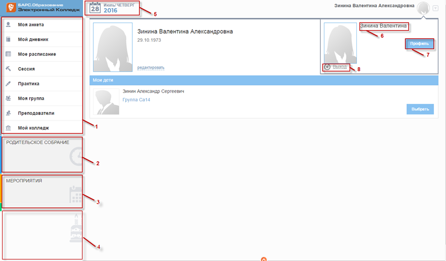 Рисунок 3 – Главное окно Системы для пользователей с ролью «Родитель»