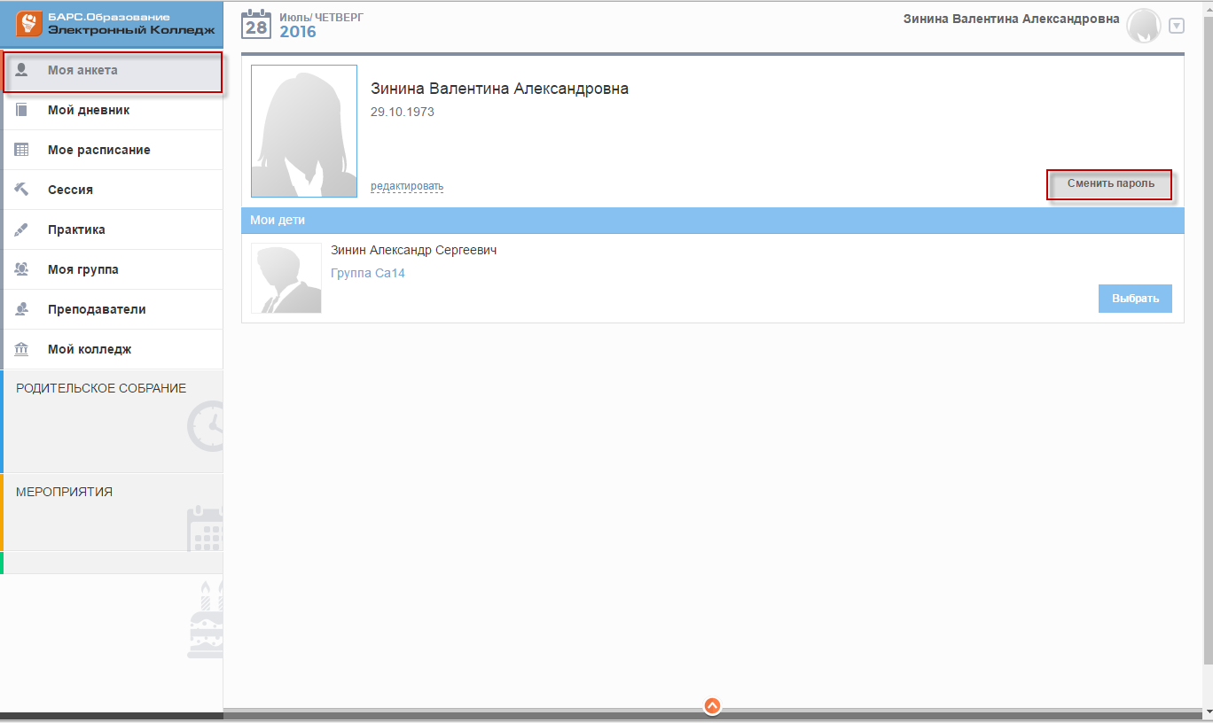 Отображение вкладки для пользователей с ролью «Родитель»При нажатии на вкладку «Моя анкета» открывается главное окно Системы
