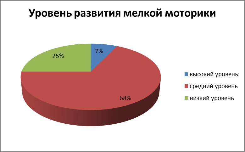 Высокий уровень развития мелкой моторики повысился и составил 29%. Средний уровень развития мелкой моторики претерпел не большие изменения. Низкий уровень (7%) остается в связи с приходом новых детей в течение года. По мере того как развивается рука ребенка, наблюдается положительное изменение в развитии речи детей, психических функций (памяти, внимания, мышления) интеллекта и физического здоровья.