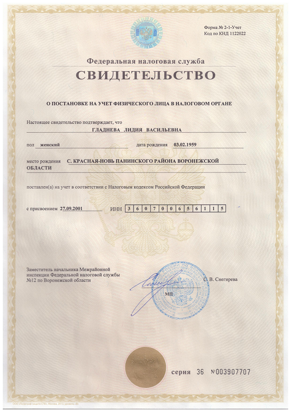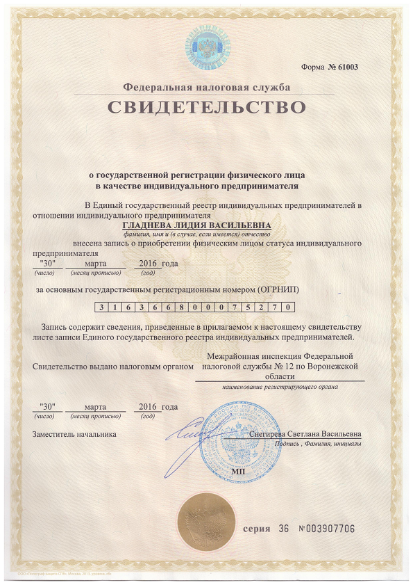Свидетельство о постановке на учет физического лица в М по Воронежской области | Серия 36 № 000 Дата постановки на учет в качестве индивидуального предпринимателя в М по Воронежской области – 30.03.2016 г. Дата выдачи свидетельства – 30.03.2016 г. |