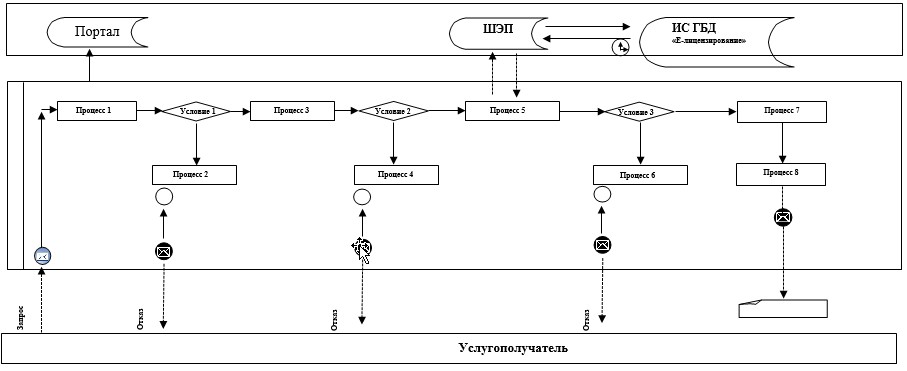 процесс 8 – получение результата оказания государственной услуги услугополучателем, сформированного ИС ГБД «Е-лицензирование». Электронный документ формируется с использованием ЭЦП руководителя услугодателя.