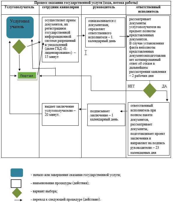 1) сотрудник канцелярии осуществляет прием документов, их регистрацию в государственной информационной системе разрешений и уведомлений (далее - ГБД «Е-лицензирование») – 15 минут;