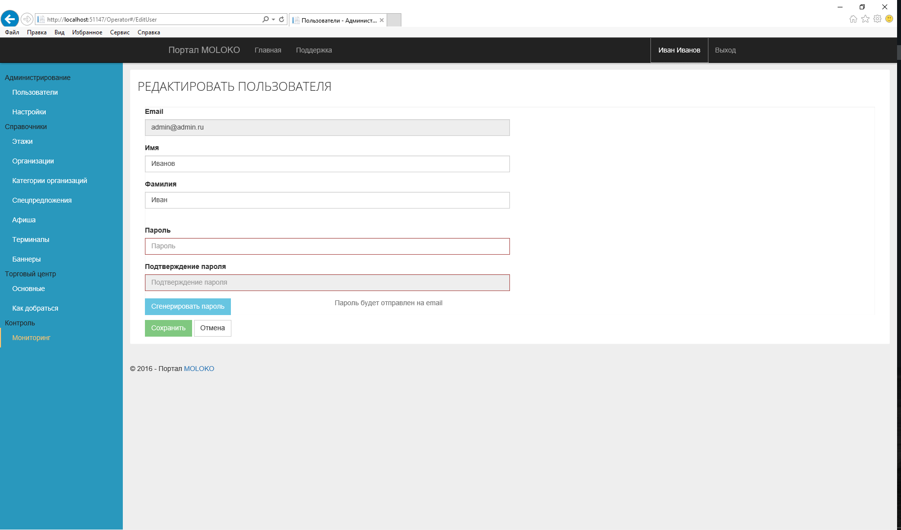 - Роль Администратора открывает доступ к разделам Портала, позволяющим администрировать ИС в целом, устанавливать системные настройки и управлять пользователями Портала. Роль Оператора открывает доступ к разделам Портала, позволяющим реализовать основное назначение программы - организацию информирования посетителей торгового центра.