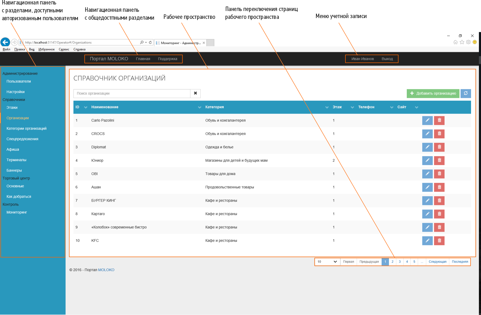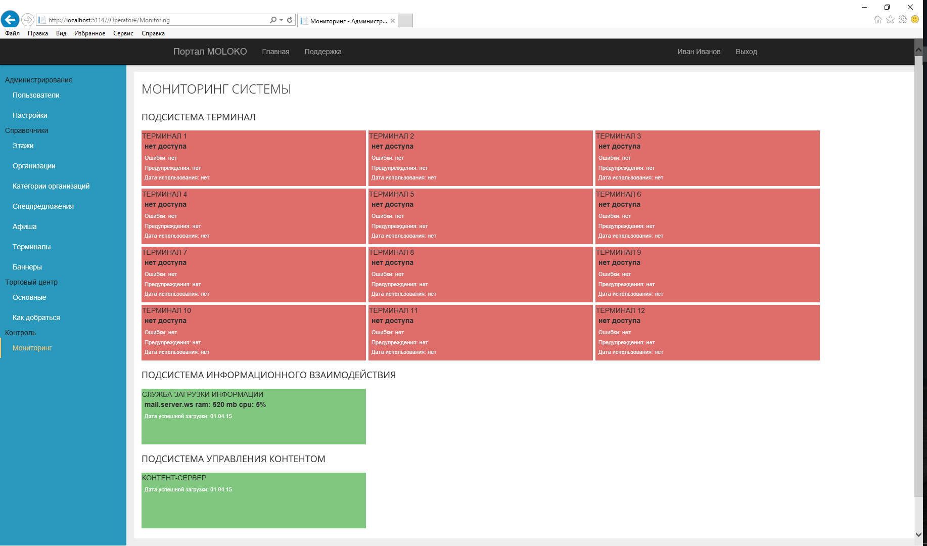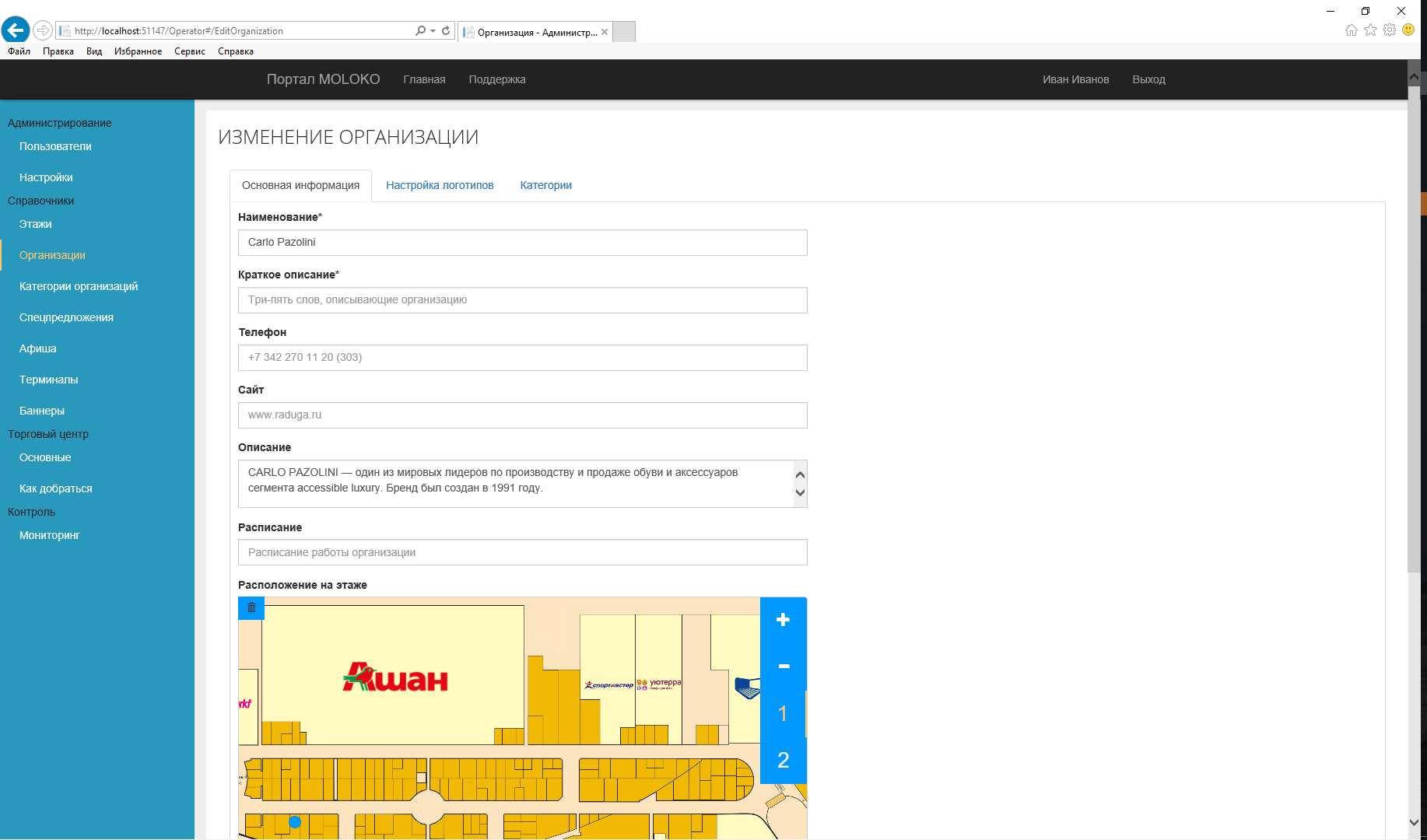 ИС «MOLOKO ИН» предназначена для информирования посетителей торгового центра о расположении организаций на территории торгового центра, специальных предложений организаций торгового центра, события торгового центра и др. посредством сенсорных терминалов, установленных на территории торгового центра.