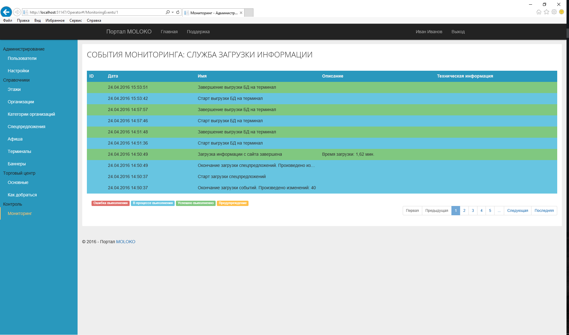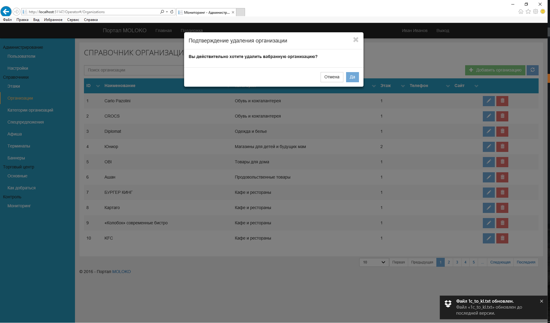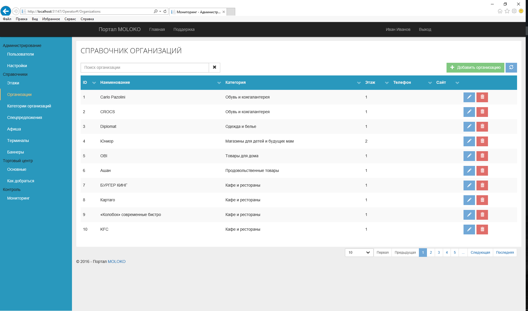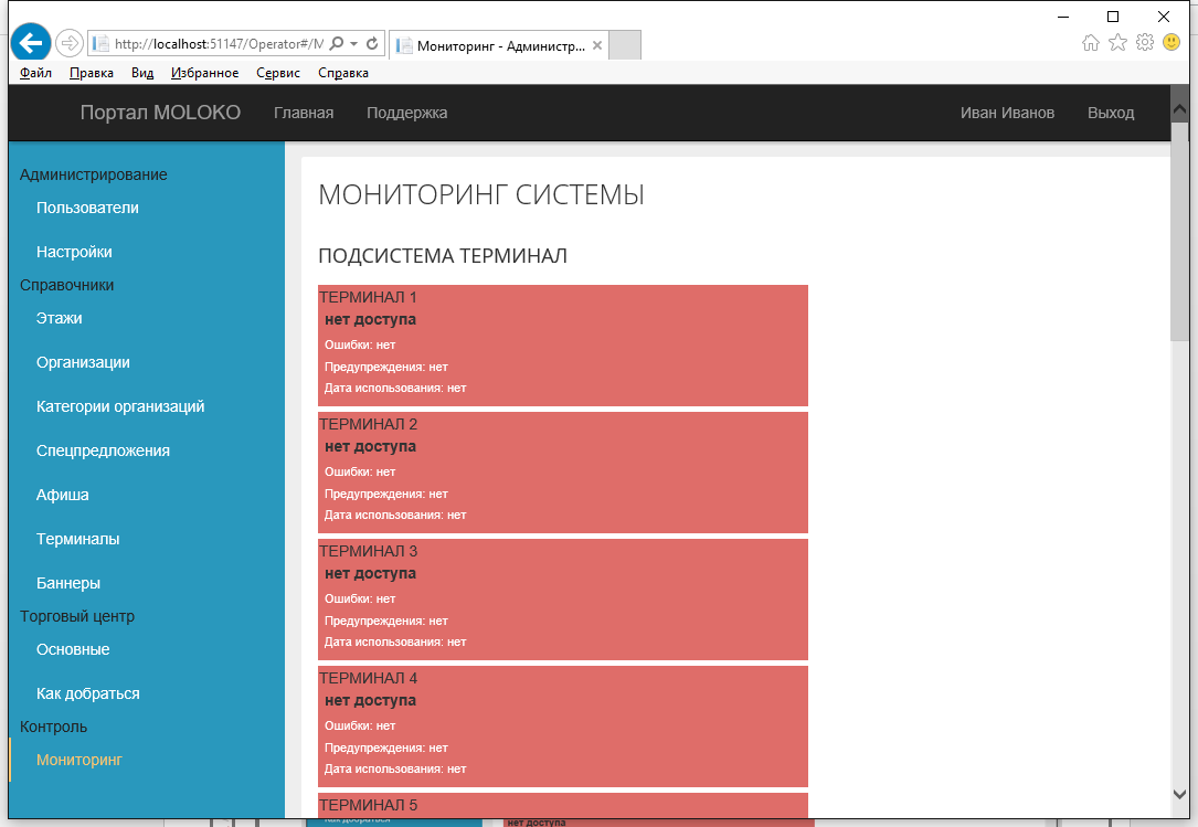 ИС «MOLOKO ИН» предназначена для информирования посетителей торгового центра о расположении организаций на территории торгового центра, специальных предложений организаций торгового центра, события торгового центра и др. посредством сенсорных терминалов, установленных на территории торгового центра.
