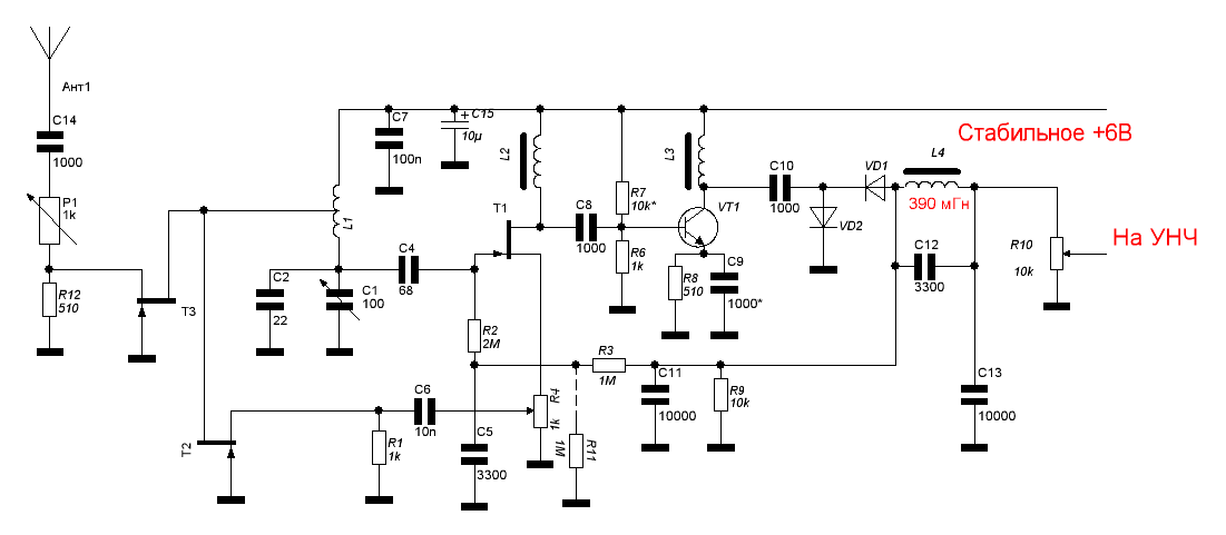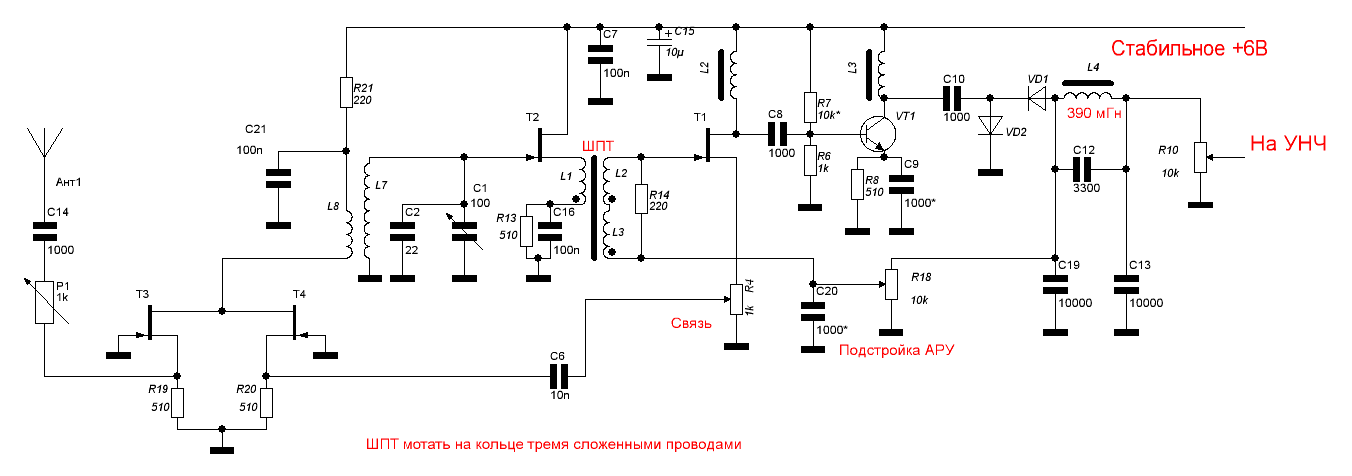 Это вообще такие приёмники, в которых всё надо на ощупь искать. Главное, чтоб схема и конструкция это позволяли. Что лучше? Ну конечно, чем больше заморочек всяких, тем большего («по идее», во всяком случае) можно достичь. Но если опыта нет, лучше оттолкнуться от простого, а потом пробовать те или иные навороты. В принципе, «могиканин» начался с очень простой схемы. Она работала очень даже неплохо, особенно до 7…8 МГц, но в процессе эксплуатации стали появляться разные идеи по улучшению. Практически всё, что сегодня нарисовал, проверено в «могиканине». Такие биполярные УВЧ и сейчас там работают, на КТ3107. Правда, я применил ещё полевой транзистор с противофазной подачей сигнала на затвор и исток на входе. Но это сделать будет никогда не поздно. Вариант с подачей ПОС через транзистор интересен тем, что не потребует для обратной связи ни дополнительных отводов, ни зависимых от частоты ёмкостных делителей. Поэтому от такого способа грех отказываться. В широкодиапазонном радио это удобное решение. Если бы были хорошие полевики с p-каналом, вообще всё просто бы вышло, но и на биполярных прилично, хотя без отвода уже хуже работает, чем с полевиками. Если катушки не предполагается переключать, удобно будет сделать УВЧ на полевиках, а стоки их подключить не на контур непосредственно, а на катушку связи, которую другим концом подключить к + питания. Вариантов множество, выбирайте тот, который вам больше подходит…