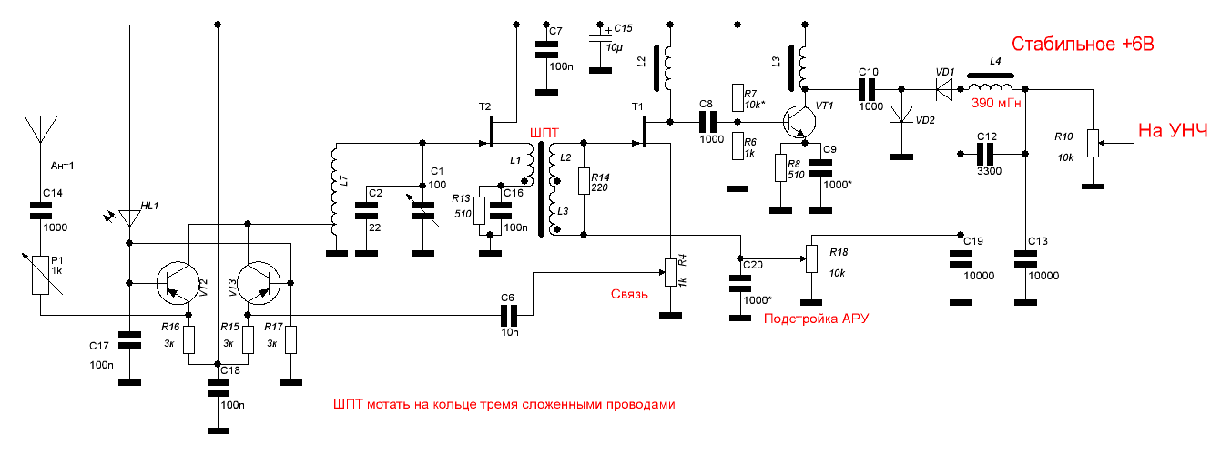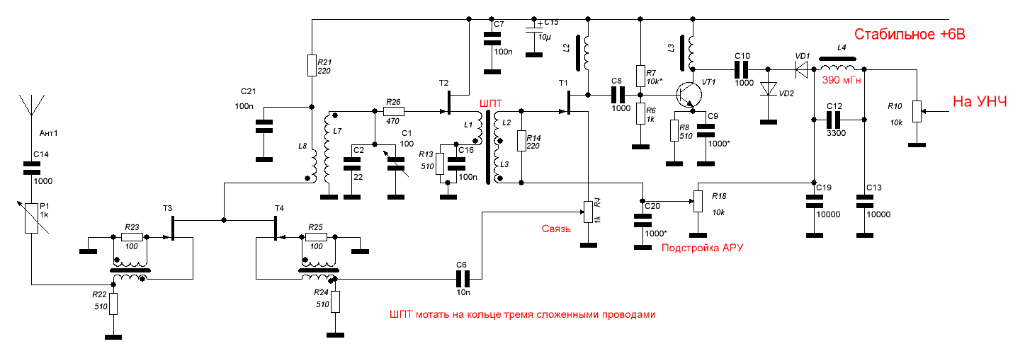 R11 на случай слишком резкой регулировки АРУ, R7 смещение УВЧ детектора, С9 можно подровнять усиление по диапазону, приподняв сверху и уменьшив снизу, чтоб компенсировать нелинейность частотной характеристики диодов детектора.